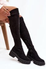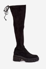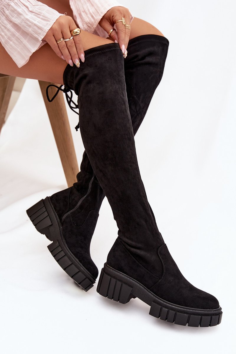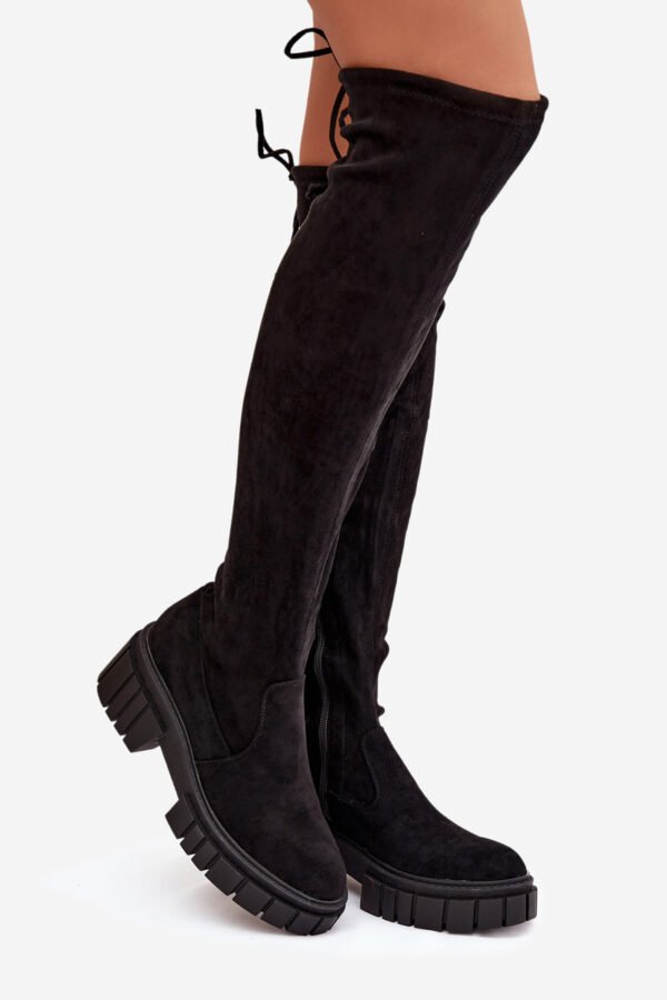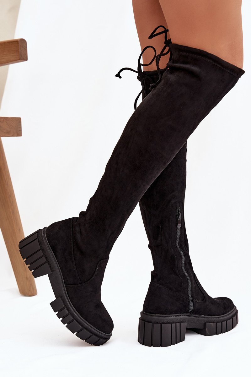 Skaisti sieviešu zābaki ar augšdaļu virs ceļgala. Modelis ir izgatavots no videi draudzīga zamšāda, kas ir patīkams uz tausti. Aizdarās ar rāvējslēdzēju augšdaļas sānos. Turklāt zābaki ir ar auklām, kas ļauj tos pareizi pielāgot. Modelis ir uzstādīts uz stabila plakanā papēža un platformas. Zābaki ir izolēti tikai pēdas augstumā ar pēdas gultni. Pastiprināts papēdis. Izvēloties izmēru, izmantojiet izmēru tabulu.