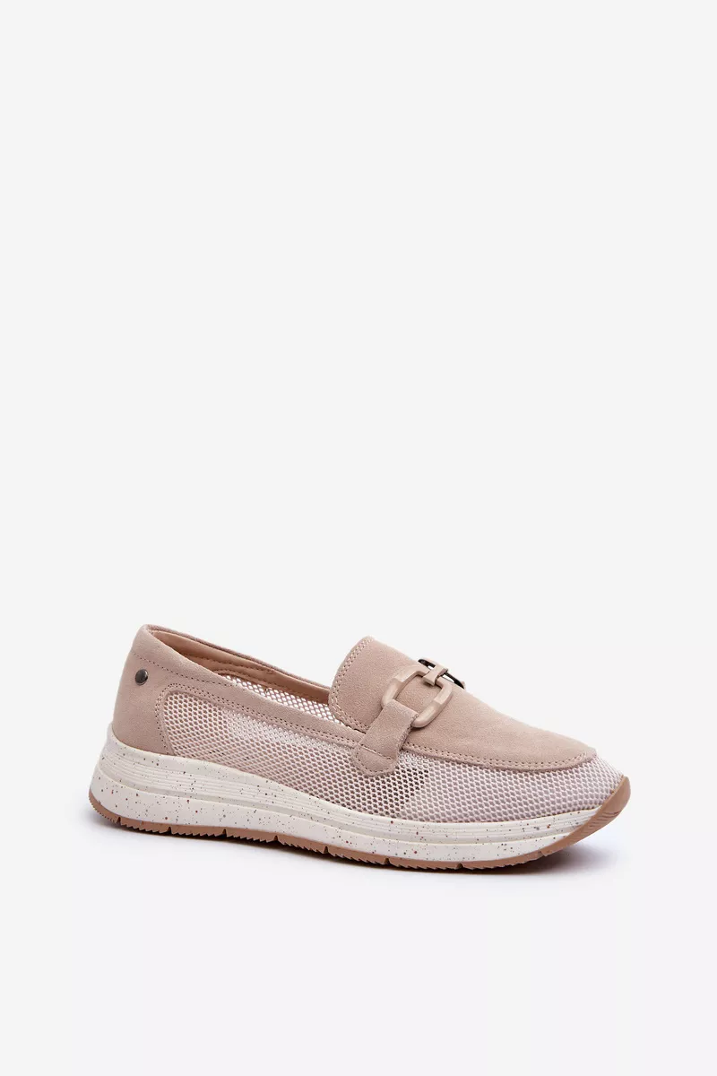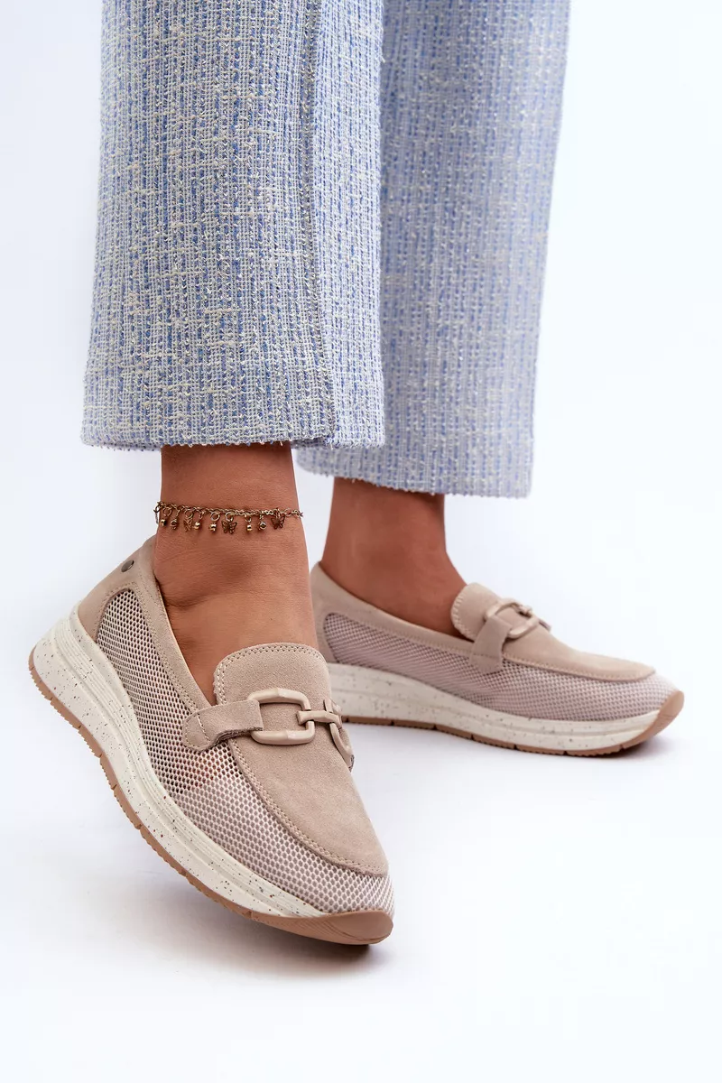 Mokasīni izgatavoti no elpojoša auduma ar smalku perforētu rakstu, kas nodrošina komfortu un gaisa cirkulāciju apavu iekšpusē. Dekoratīvā sprādze augšdaļā piešķir eleganci, bet platforma un smalks papēdis nodrošina komfortu ejot. Šie mokasīni ir lieliska izvēle sievietēm, kas novērtē funkcionalitātes un stilīga izskata kombināciju. Izvēloties izmēru, lūdzu, skatieties izmēru tabulu.