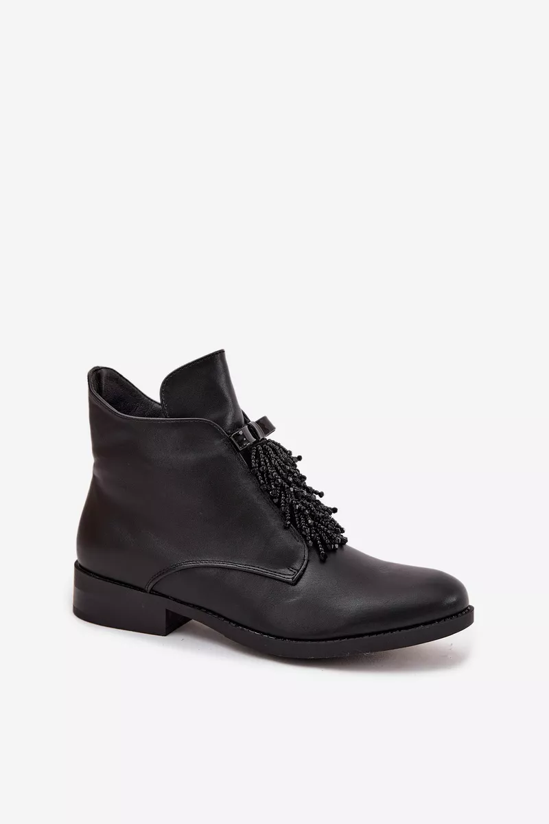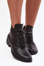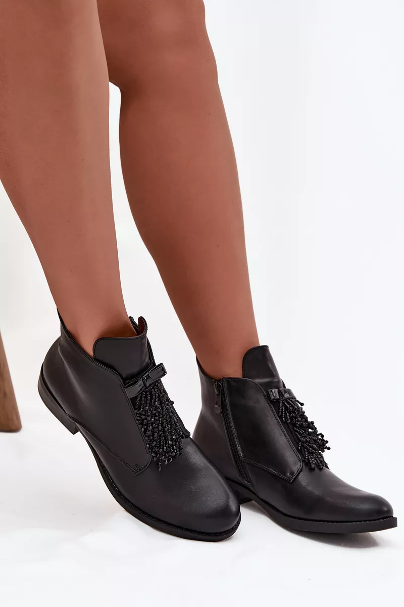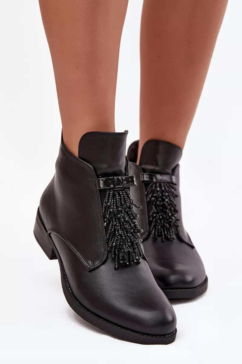 S.Barski zīmola sieviešu potītes kurpes ir komforta un modes, oriģināla akcenta apvienojums. Tās ir izgatavotas no augstas kvalitātes ekoloģiskas ādas, izskatās eleganti un ir izturīgas. Zems papēdis nodrošina komfortu un brīvību ikdienas lietošanai. Iekšpuse ir odere ar mīkstu audumu, padarot zābakus ideālus aukstām dienām, nodrošinot siltumu un komfortu. Dekoratīvā detaļa priekšā, kas izpaužas kā pērlītes, piesaista uzmanību un piešķir visam izteikti sievišķīgu raksturu. Rāvējslēdzējs atvieglo apavu uzvilkšanu un novilkšanu. Tie labi sader ar kleitām, svārkiem un biksēm.