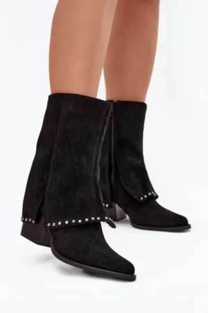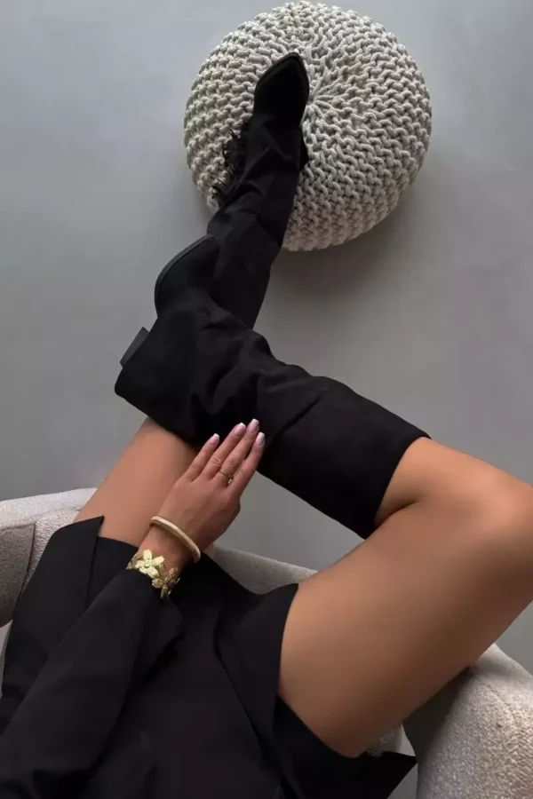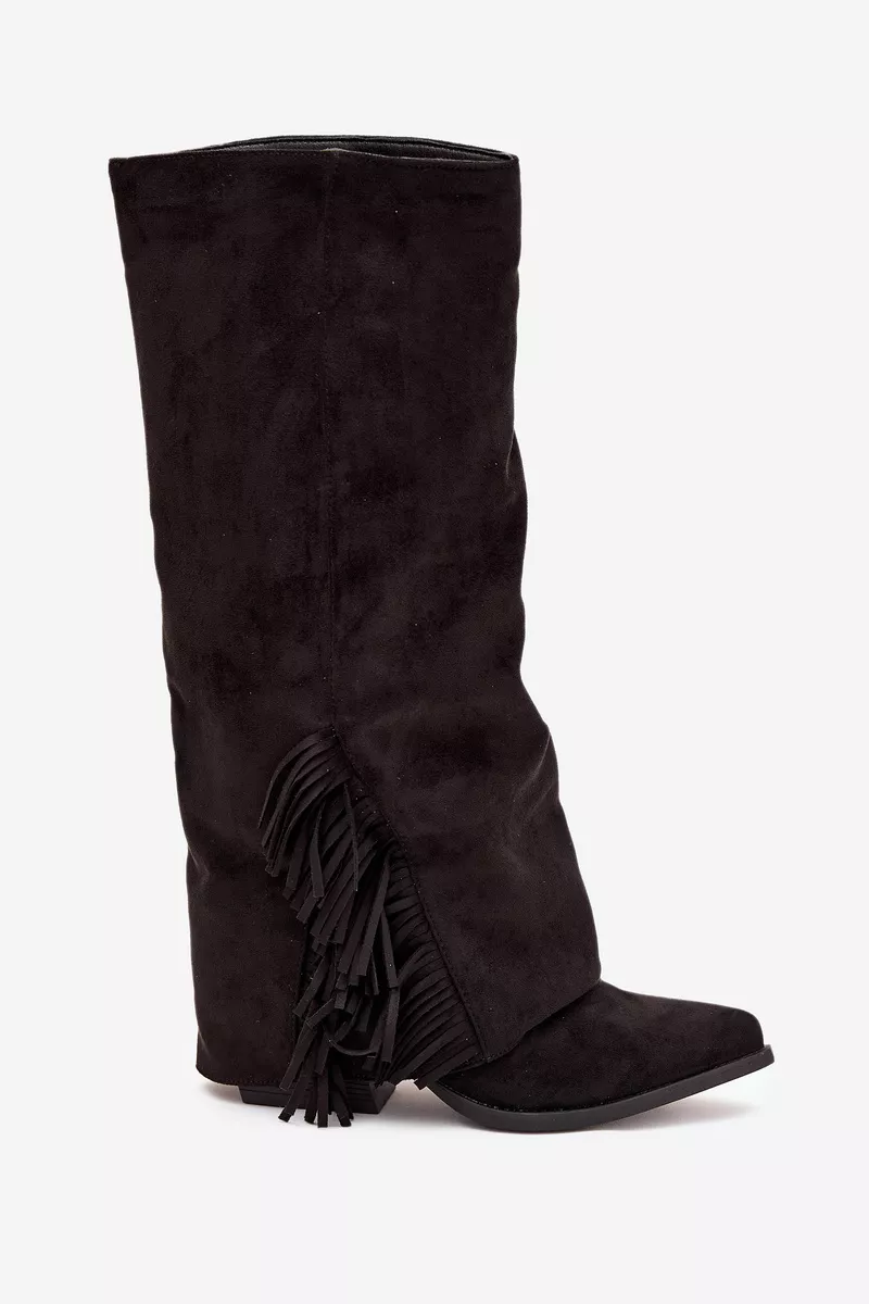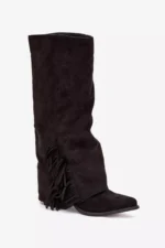 Šie uzvelkamie kovboju zābaki no ekoloģiskā zamšāda ar blokveida papēžiem apvieno komfortu un stilu. Smaileveida purngali piešķir eleganci, bet dekoratīvās fringes uz augšdaļas piešķir vieglu boho pieskārienu. Tie ir ideāli piemēroti ikdienas stilam, labi sader ar kleitām, svārkiem un biksēm, piešķirot jebkuram apģērbam kovboju šarmu. Izvēloties savu izmēru, lūdzu, izmantojiet izmēru tabulu.