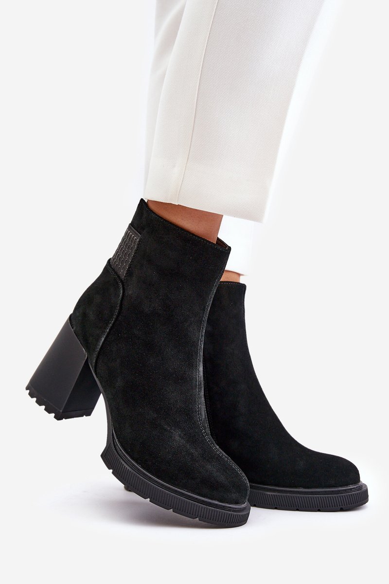 Šie elegantie potītes zābaki no dabiskas zamšādas ir lieliska izvēle vēsākām dienām. Ar stabilu blokveida papēdi tie nodrošina komfortu visas dienas garumā. Iekšpuse ir odere ar aitas vilnu, kas nodrošina siltumu un komfortu pat aukstās dienās. Praktiskais rāvējslēdzējs ļauj tos ātri un viegli uzvilkt un novilkt. Lūdzu, izvēloties savu izmēru, skatieties izmēru tabulu.