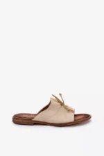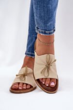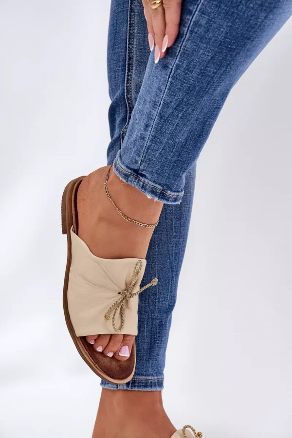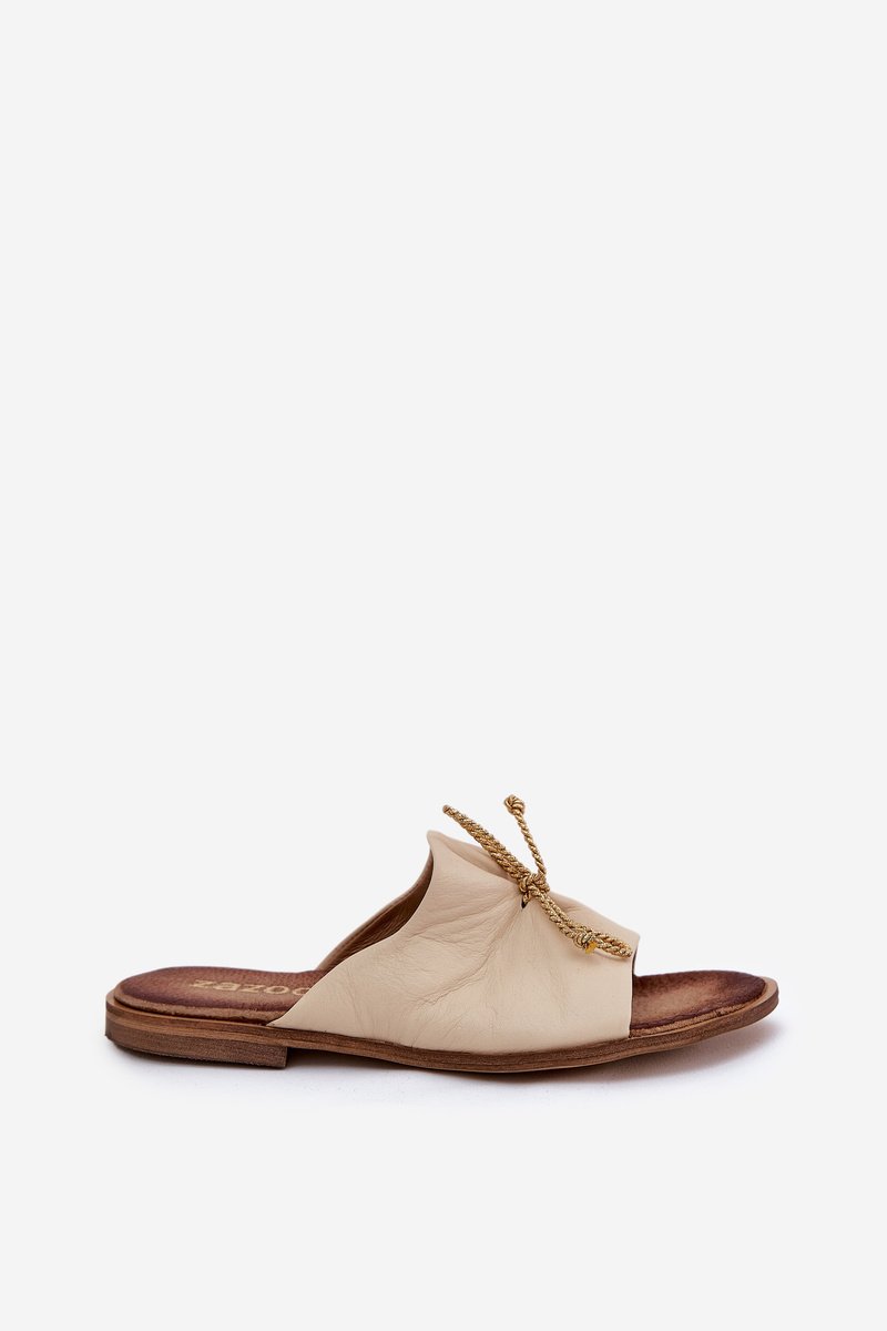 Ērtas čības, kas rotātas ar modernu pītu auklu. Smalki krokas piešķir šīm čībām izsmalcinātu izskatu. Apavi ir pilnībā izgatavoti no ādas. Tām ir cieta plastmasas zole. Mīkstā iekšzole nodrošinās komfortu pat karstās dienās! Noteikti apskatiet visu mūsu sieviešu sandāļu kolekciju! Izmantojiet izmēru tabulu, lai izvēlētos savu izmēru.