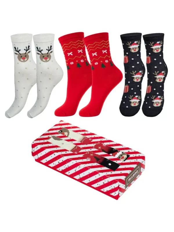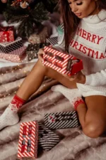 Svinīgas sieviešu zeķes, iepakotas skaistā kastītē, ir lieliska dāvana. Komplektā ir trīs pāri ar dažādiem ziemas motīviem, kas radīs svētku noskaņu jūsu garderobē. Mīkstas, ērtas un patīkamas valkāt — ideālas aukstām dienām un kā stilīga svētku dāvana.